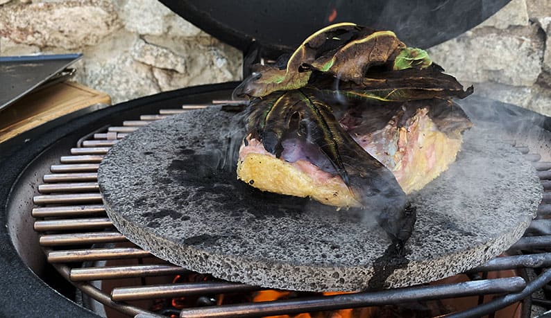 3. Den Lavastein vorheizen und das Entenbruststück mit der Hautseite nach unten darauflegen (die Blätter nicht entfernen) und 25 Minuten auf dieser Seite garen.