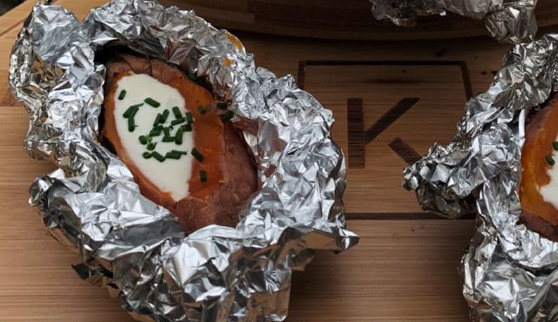 Nach gründlichem Waschen, Bürsten und Abspülen werden die Kartoffeln mit Schale in Alufolie gewickelt und direkt in die Glut des Grills gelegt. Diese Garmethode verleiht der Kartoffel ein intensives Aroma, sie gart im eigenen Dampf und nimmt eine feine Rauchnote an. Nach etwa 30 Minuten Garzeit aus der Glut nehmen, zerdrücken, halbieren, aushöhlen und füllen – zum Beispiel mit einem Stück gesalzener Butter, Olivenöl, Crème fraîche und Schnittlauch.