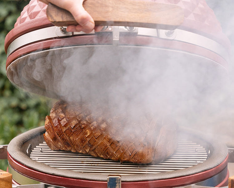 Un utilisateur cuisine de la viande et des légumes sur un kamado Kokko rouge en céramique, couvercle ouvert, lors d’un moment convivial en extérieur.